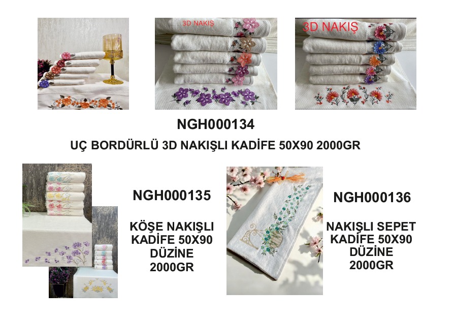 Bu ürün sayfasında bordürlü, köşe nakışlı ve sepet desenli 3D nakışlı kadife havlu modelleri bulunmaktadır. Sipariş sırasında istediğiniz modeli belirtebilirsiniz.