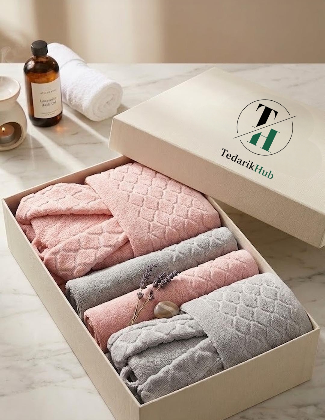 Şık kutu tasarımı ve zarif renk uyumuyla hazırlanan premium havlu seti.