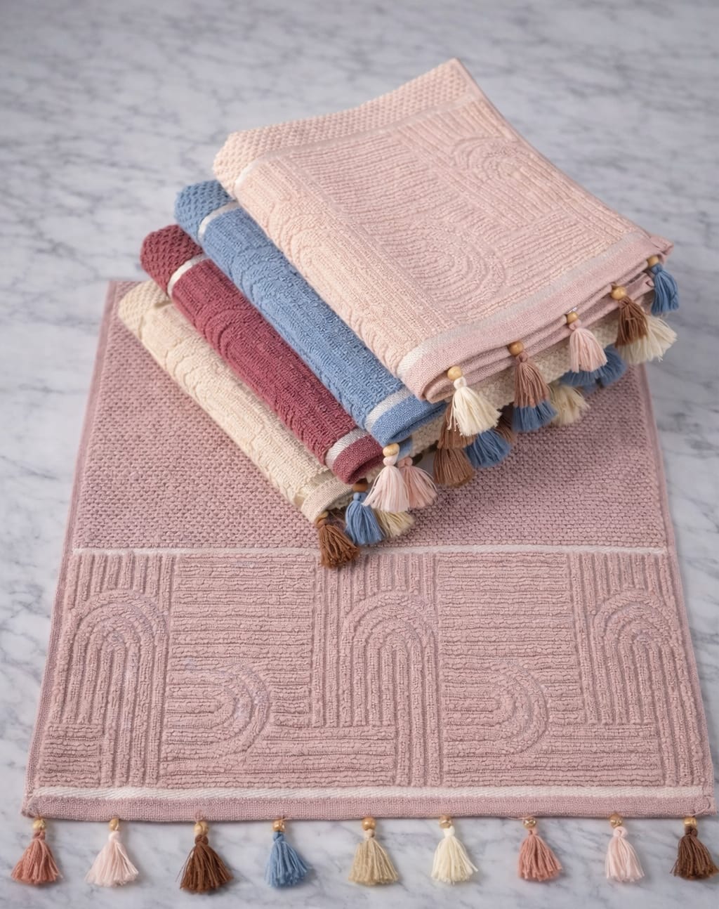 Banyonuza zarafet ve konfor katacak püskül detaylı jakarlı havlu seti.