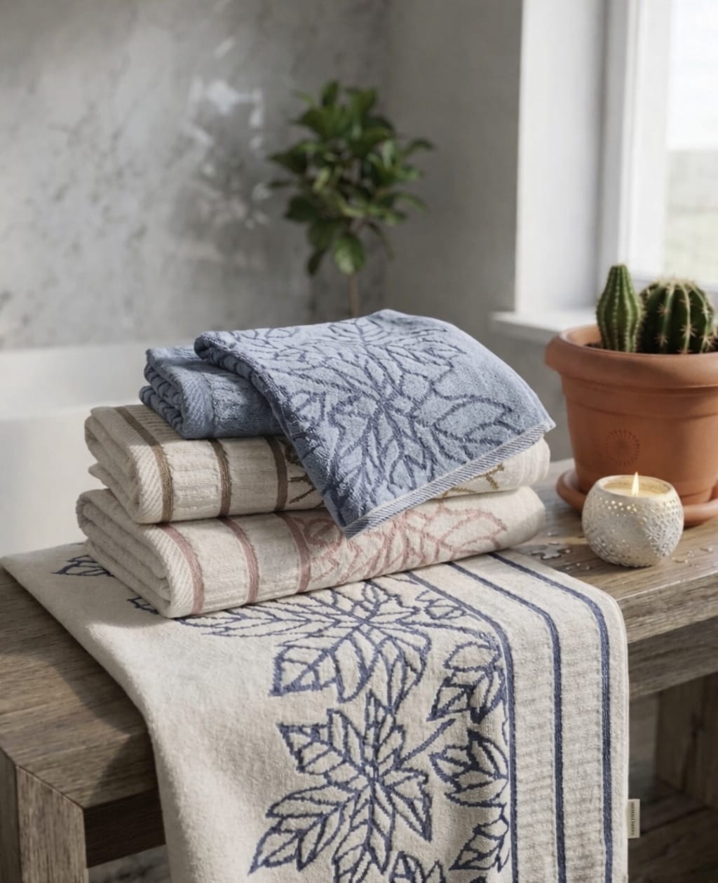 Doğadan ilham alan yaprak desenleri ve modern renk tonlarıyla tasarlanmış premium havlu seti.